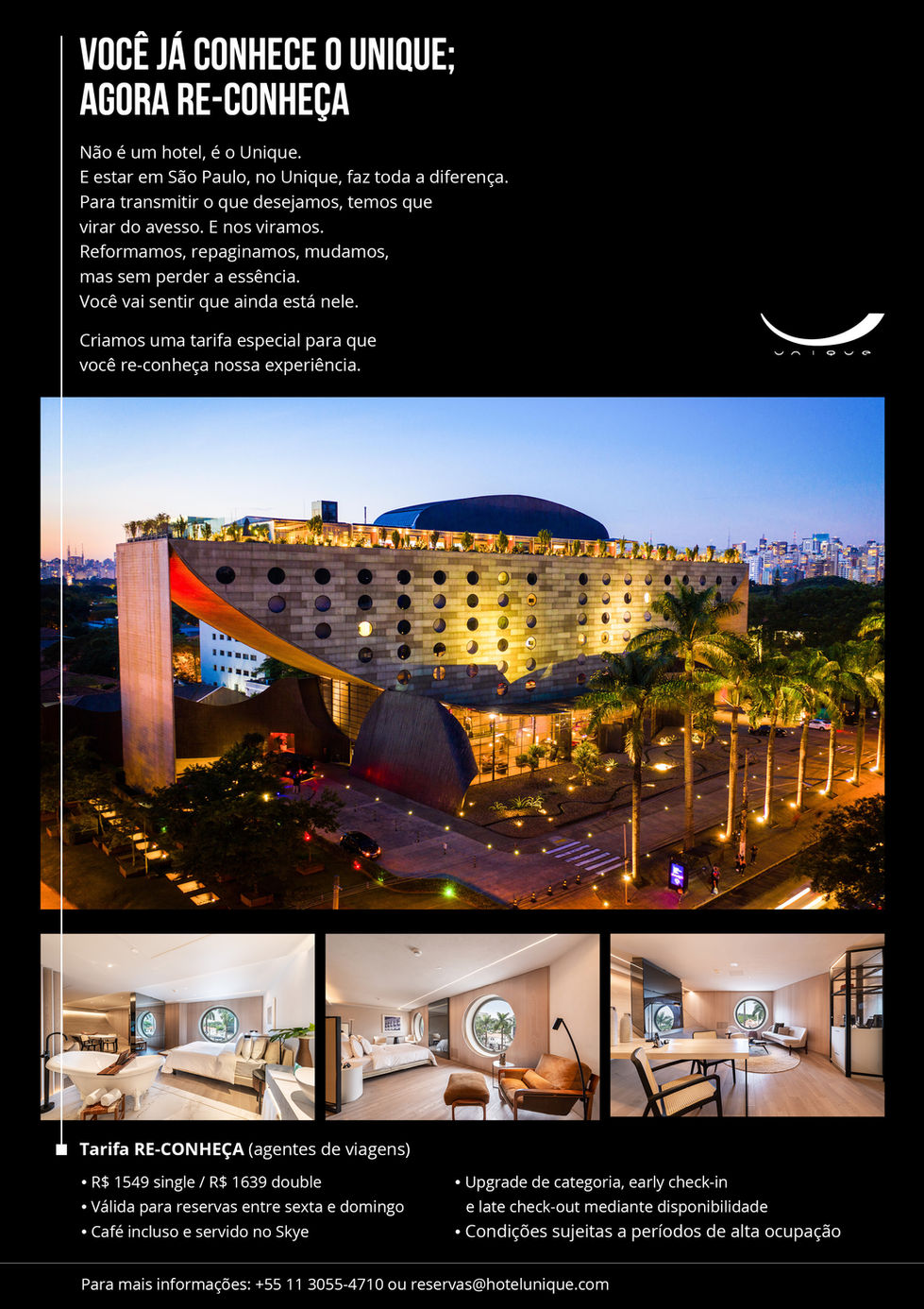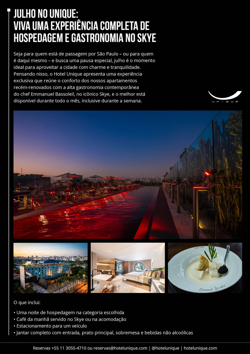 Criação de lâminas digitais para divulgação de promoções do Hotel Unique, enviadas por e-mail e WhatsApp. A diagramação une imagens impactantes e design limpo para garantir uma leitura fácil, elegante e envolvente para o público de luxo.